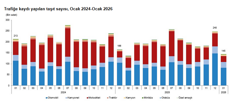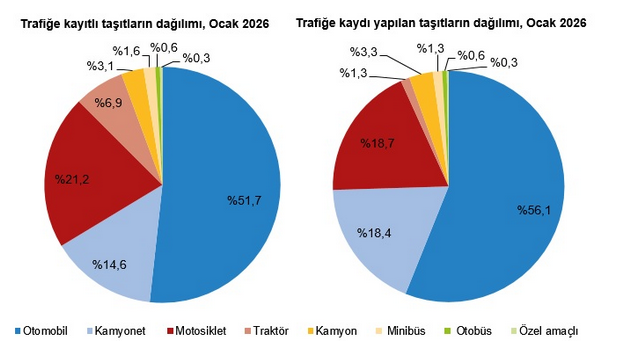 Türkiye İstatistik Kurumu’nun (TÜİK) verilerine göre, Ocak'ta trafiğe kaydı yapılan taşıtların yüzde 56,1'ini otomobil, yüzde 18,7'sini motosiklet, yüzde 18,4'ünü kamyonet, yüzde 3,3'ünü kamyon, yüzde 1,3'ünü minibüs, yüzde 1,3'ünü traktör, yüzde 0,6'sını otobüs ve yüzde 0,3'ünü özel amaçlı taşıtlar oluşturdu.