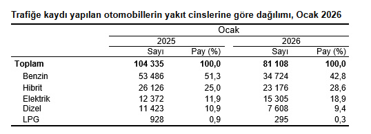 Ocak'ta trafiğe kaydı yapılan 81 bin 108 adet otomobilin yüzde 42,8'i benzin, yüzde 28,6'sı hibrit, yüzde 18,9'u elektrikli, yüzde 9,4'ü dizel ve yüzde 0,3'ü LPG yakıtlıdır. Ocak ayı sonu itibarıyla trafiğe kayıtlı 17 milyon 457 bin 542 adet otomobilin ise yüzde 32,5'i dizel, yüzde 31,0'ı benzin, yüzde 30,0'ı LPG, yüzde 4,1'i hibrit ve yüzde 2,2'si elektriklidir. Yakıt türü bilinmeyen otomobillerin oranı ise yüzde 0,2'dir.
